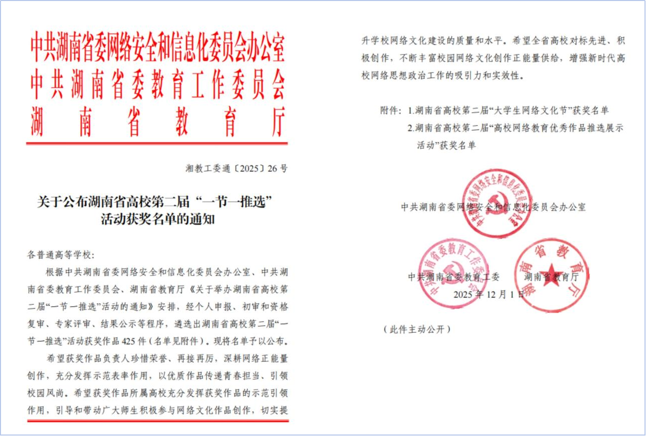 (通讯员 何楚静 王欣悦)近日,由中共湖南省委网络安全和信息化委员会办公室、中共湖南省委教育工作委员会、湖南省教育厅主办的湖南省高校第二届“一节一推选”活动作品评选结果公布,我校共20项作品成功入选。其中,“大学生网络文化节”一等奖6项、二等奖2项、三等奖3项;“高校网络教育优秀作品推选展示活动”一等奖6项、二等奖3项。我校历来高度重视网络育人工作,自2003年起在全国范围内率先设置网络教育办公室,组建“1+...