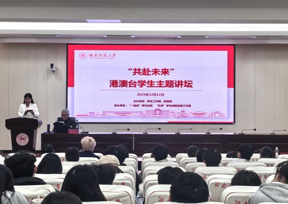 (通讯员 杨灵睿)12月11日晚,湖南师范大学“一站式”社区“共赴未来”港澳台学生主题讲坛在中和讲堂举行,全校180余名港澳台学子参加。历史文化学院周秋光教授以《湖南人与湖湘精神》为主题,系统梳理湖湘文化的发展脉络及精神内核,解读湖湘精神中“心忧天下、敢为人先”的时代价值,深化港澳台学子对中华优秀传统文化的理解与认同。信息科学与工程学院钟坚成教授以《漫谈大数据与人工智能》为题展开分享,结合典型应用案例...