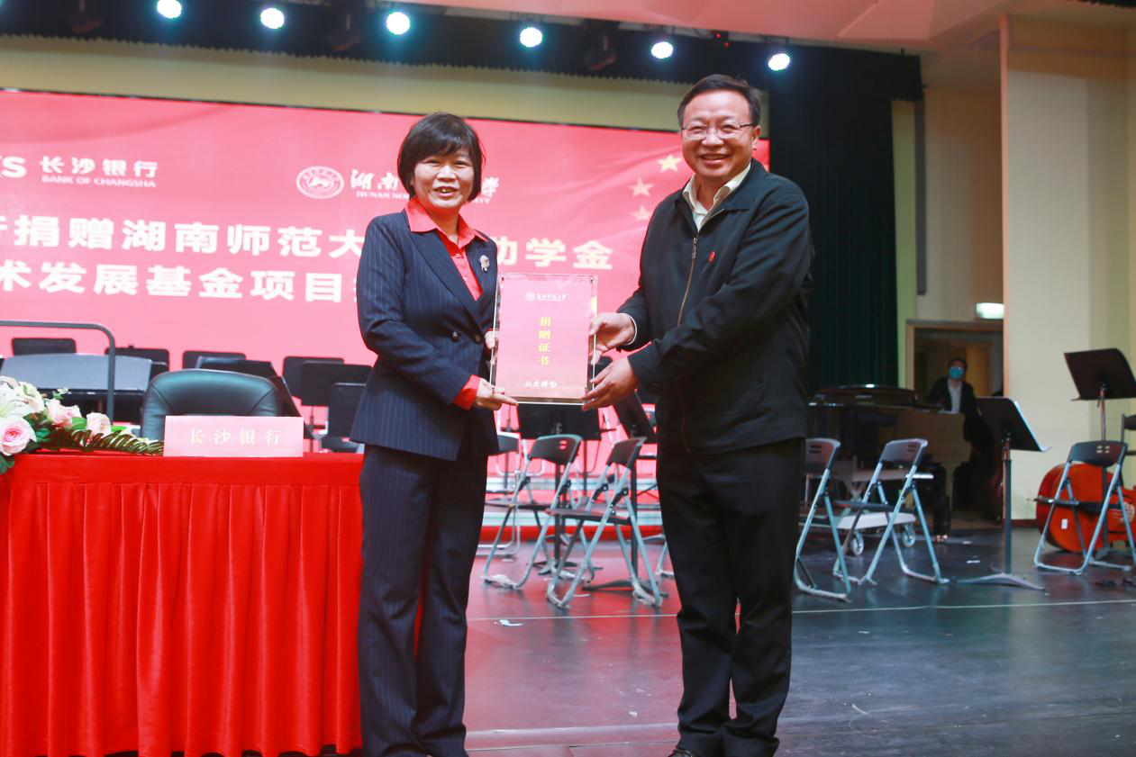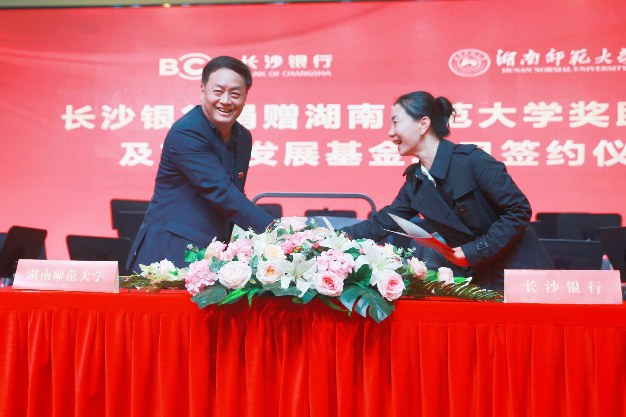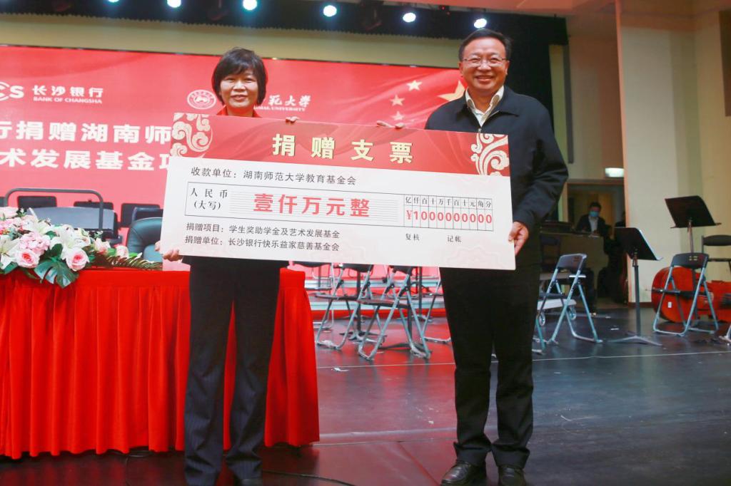 (供稿 校友总会)10月24日,在建校83周年校庆日到来前夕,长沙银行奖助学金及艺术发展基金捐赠项目签约仪式于我校音乐学院和乐楼四楼大音乐厅举行。长沙银行捐款1000万元人民币,设立湖南师范大学奖助学金及艺术发展基金项目。湖南省政协原副主席谭仲池,长沙银行党委副书记、行长赵小中,长沙银行工会主席、快乐益家慈善基金会理事长李建英,长沙银行工会副主席李晓蓉,我校校长刘起军,副校长刘怀德、王辉出席签约仪式。捐赠仪式由我校校友总会·教育基金会秘书长梁勇主持。