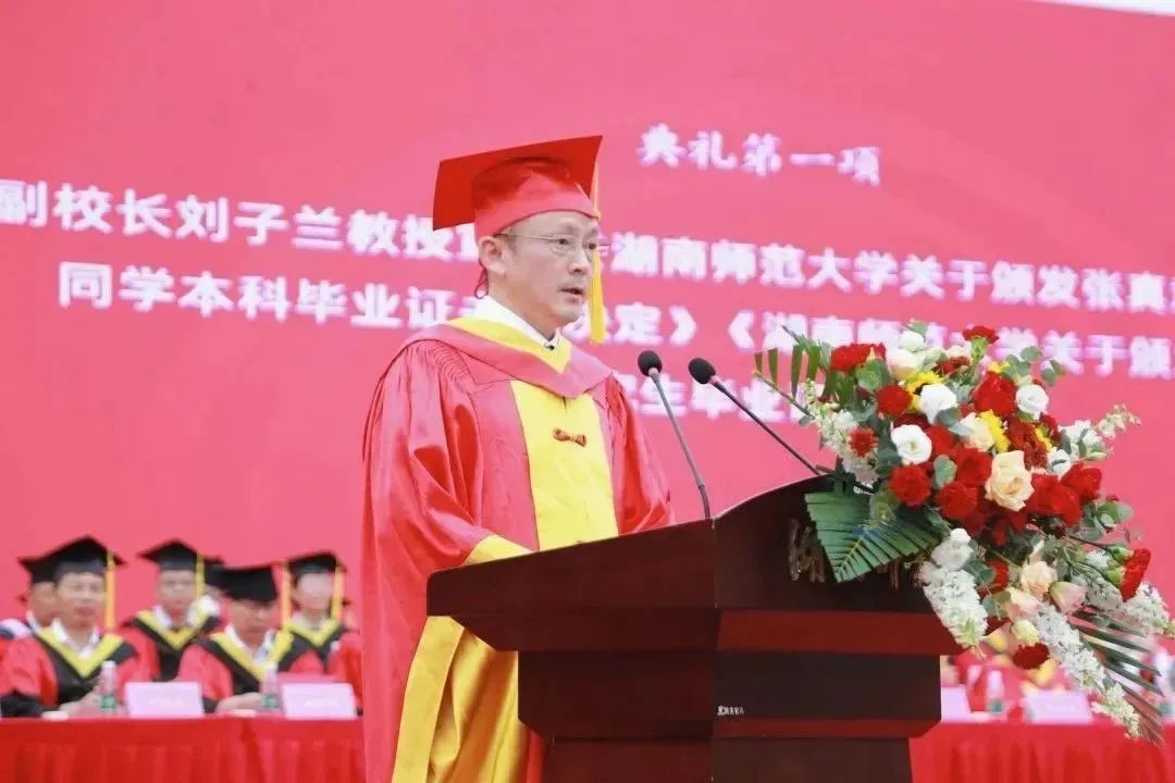 副校长刘子兰教授宣读《湖南师范大学关于颁发张真意等5690名同学本科毕业证书的决定》《湖南师范大学关于颁发博士、硕士研究生毕业证书的决定》。