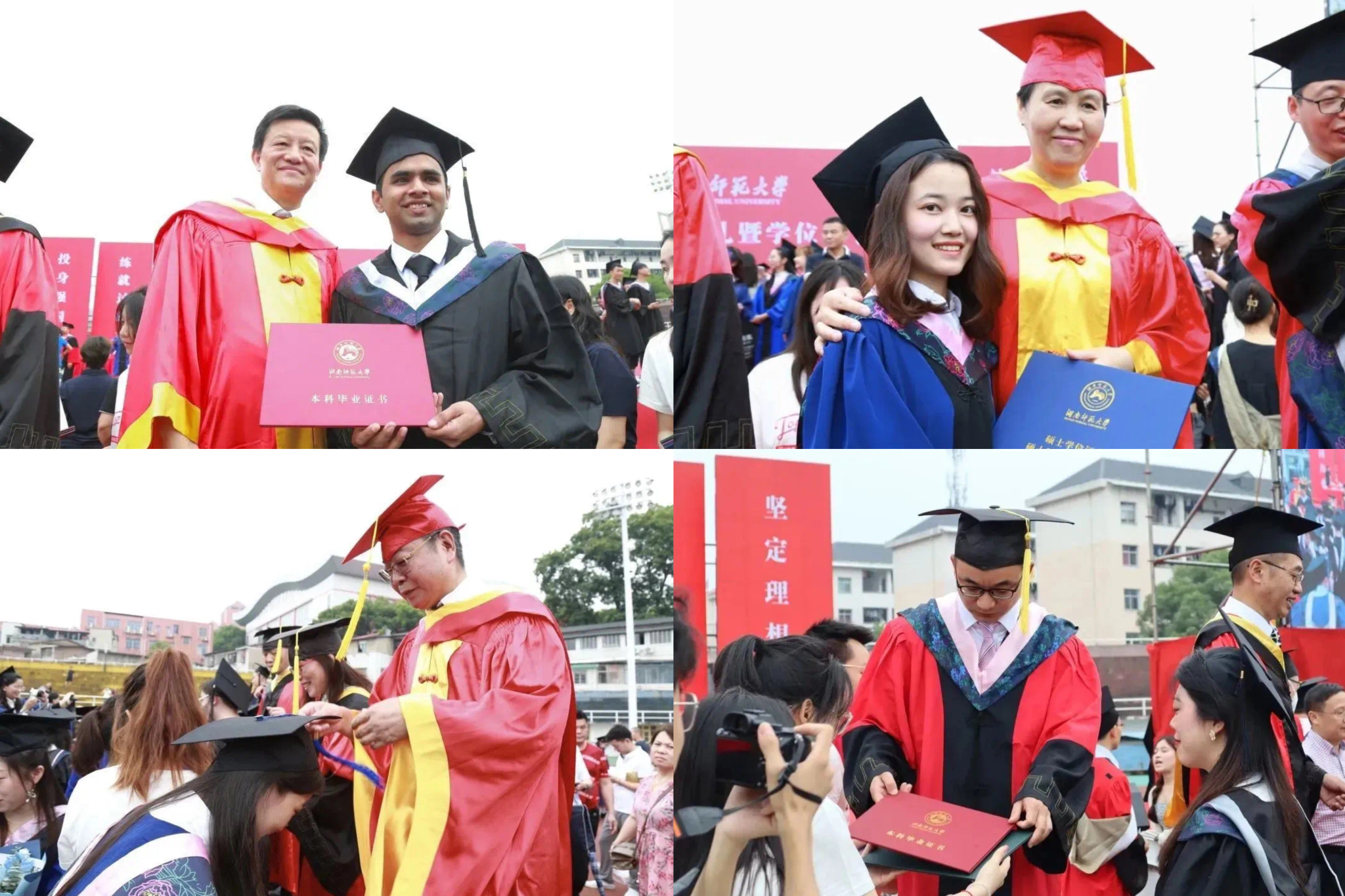 仪式开始之前,现场播放了全体毕业生辅导员祝福视频,并举行“青春为祖国歌唱”2023届毕业典礼文艺演出。体育学院带来开场表演《狮舞少年》点燃全场气氛;外国语学院带来多语种演唱曲目《栀子花开》,倾诉对青春别离的不舍;物理与电子科学学院和商学院学子演唱《凤凰花开的路口》,唤醒大家独特的青春记忆;学院党委副书记代表、毕业生辅导员带来歌曲《祝你一路顺风》,表达对毕业生的不舍和祝愿;音乐学院学子带来校园歌曲串烧《光阴的故事+鹿befree+海芋恋》,唱出了在师大的青葱记忆与光辉岁月;天籁合唱团合唱《当+这世界那么多人+再见》,和所有毕业生挥手告别。