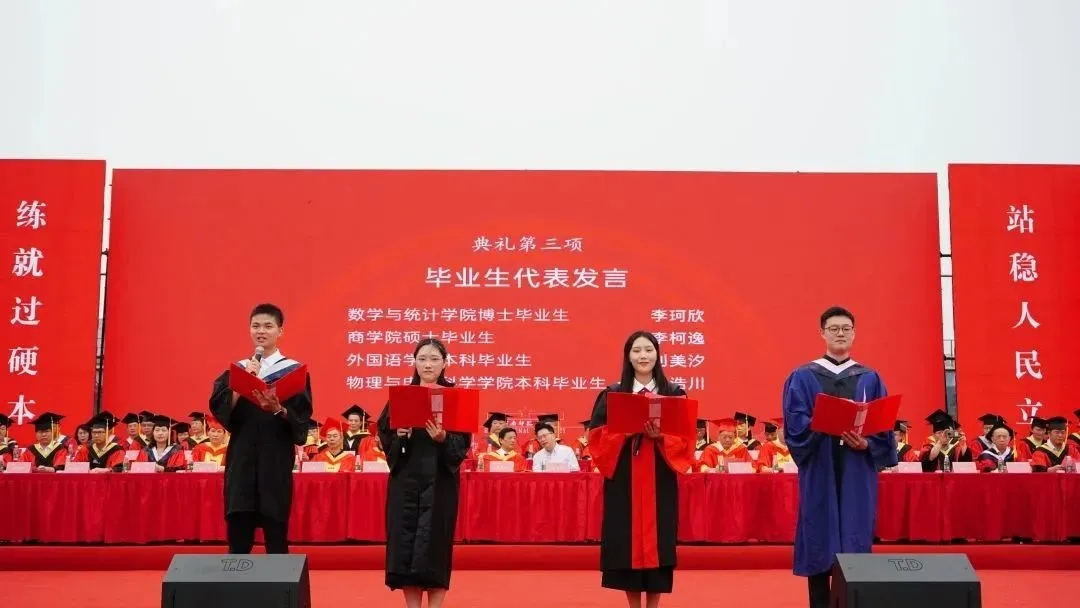 数学与统计学院博士毕业生李珂欣、商学院硕士毕业生李柯逸、外国语学院本科毕业生刘美汐、物理与电子科学学院本科毕业生尹浩川作为毕业生代表发言。他们回忆在师大求学和成长的经历,表达了对母校的感激和对未来的无限憧憬,并一同为毕业生们送上美好的祝愿。