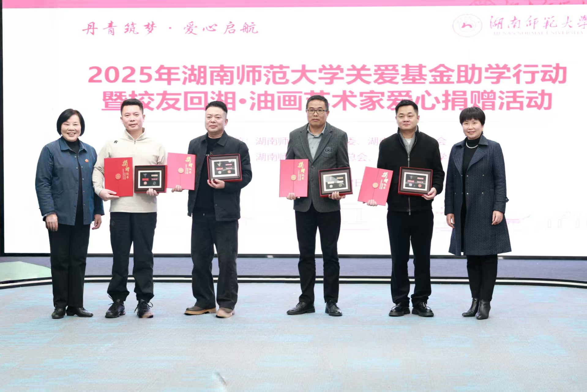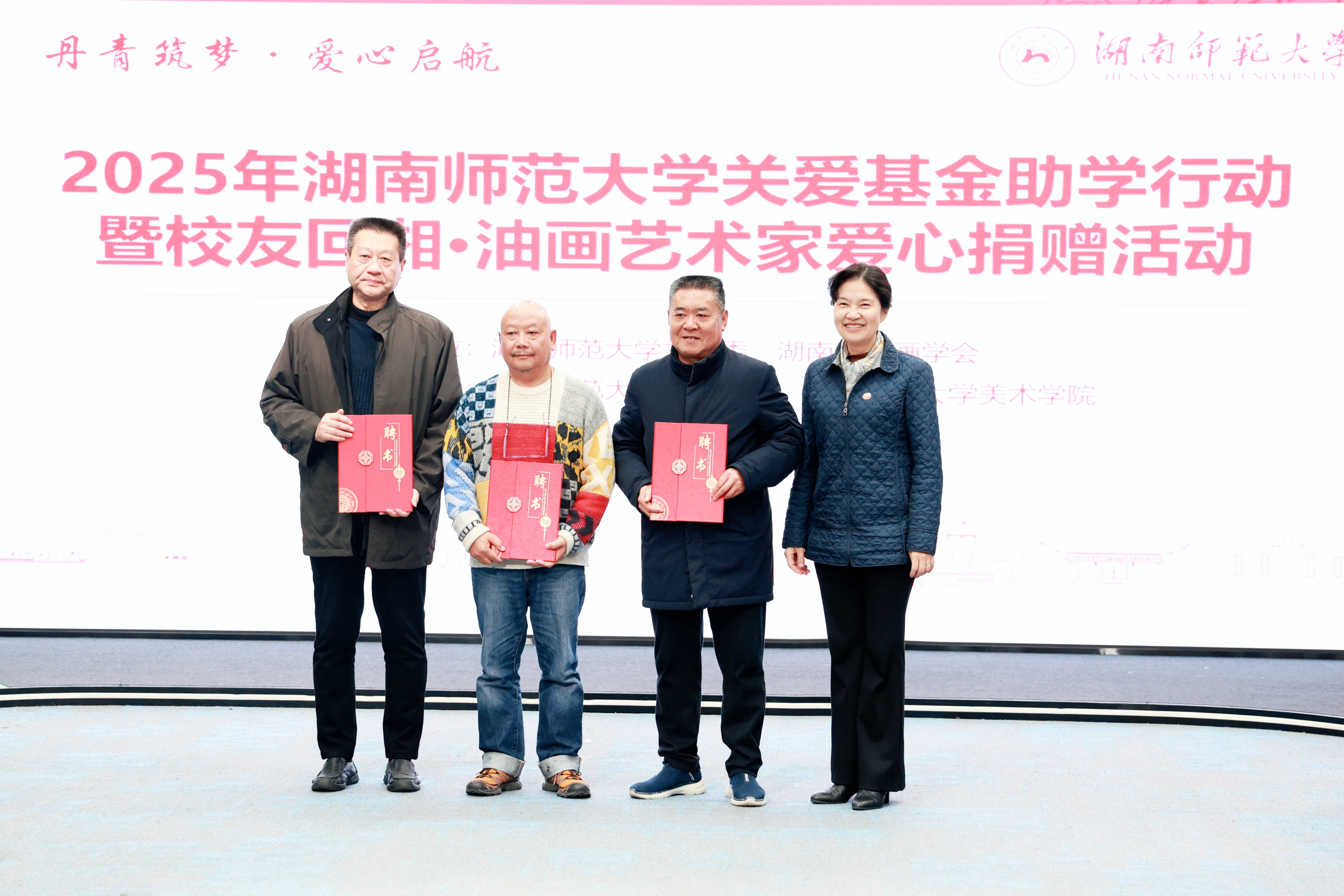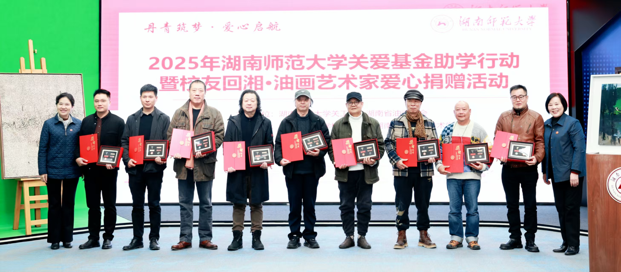 12月22日下午,由校关工委、湖南省油画学会主办,校友总会、美术学院协办的“丹青筑梦爱心启航”2025年湖南师范大学关爱基金助学行动暨校友回湘•油画艺术家爱心捐赠活动在我校融媒体中心展播厅举行,校党委副书记、关工委主任段巍,关工委常务副主任徐书华出席活动。离退休处负责人尹建新主持活动。