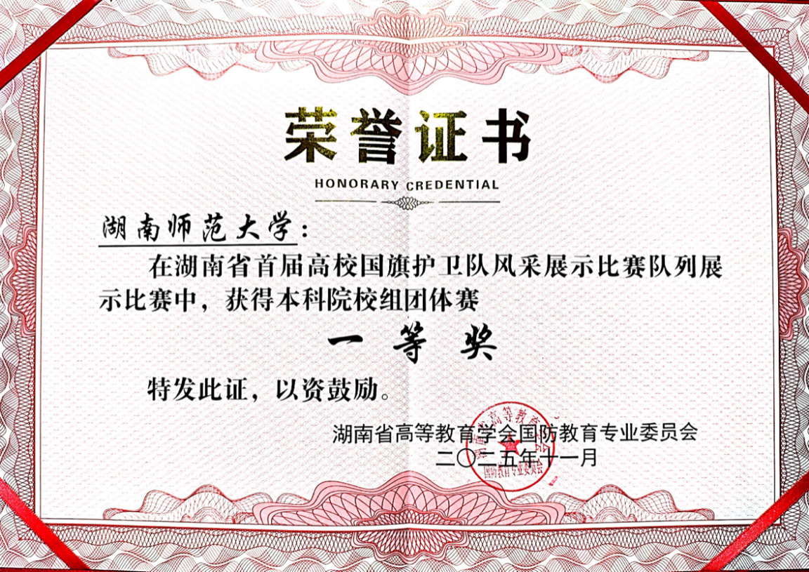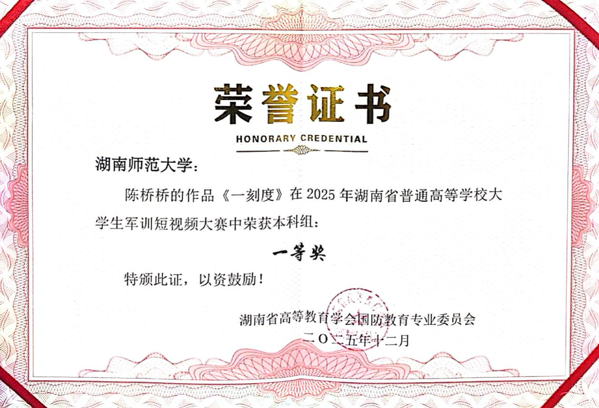 本次会议总结了2025年度国防教育工作,研究了2026年工作及专业委员会“一五五”规划,并对本年度的各项国防教育赛事进行表彰。其中,我校荣获2025年湖南省高校国防教育研究与实践先进单位、升国旗仪式展示赛本科组一等奖、队列会操本科组一等奖等多个奖项。学生陈桥桥的作品《一刻度》荣获军训短视频大赛本科组一等奖。