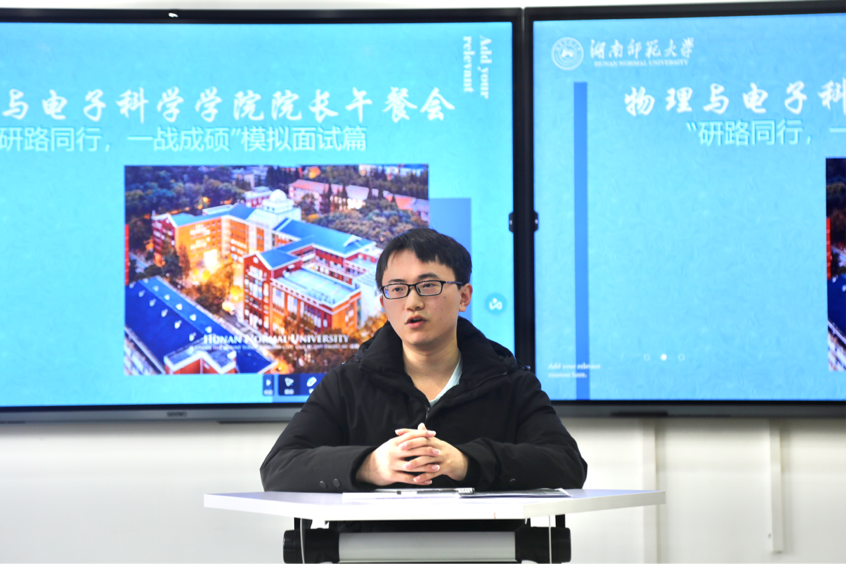 模拟面试过程中,2019级光召班廖明华、2019级师范物理班周芷若、2019级电子班王雪松依次上台进行英语自我介绍并完成两道必答题和一道选答题。教授们根据同学们的自我介绍和回答,对三位同学的表现作出了专业视角的点评与指导意见。教授们从自我介绍提升、简历亮点凸显、学术话语表达、个人仪态展现、面试注意事项等方面阐释了自己的见解,并帮助同学们梳理知识脉络、掌握提问特征、了解展示重点、提高面试技能。