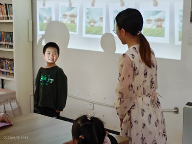 志愿者提前制作了绘本幻灯片以供小朋友们一起观看。曾昱嫦通过向小朋友们提问秋天会做的事情,引出了绘本故事——《14只老鼠的秋天进行曲》。在故事中,老鼠老六不见了,其他老鼠全部一起寻找,最终在秋日集会的游行队伍里找到了老六。曾昱嫦从故事主题出发,向小朋友们提问,引导小朋友们领会一家人之间要相亲相爱的道理。