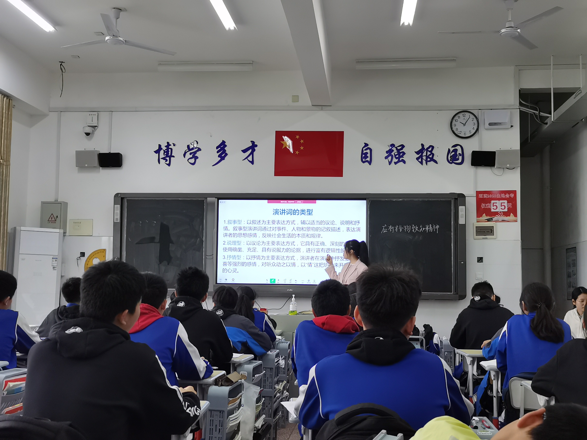 队员何苗首先以一则新闻导入课文《应有格物致知精神》,然后介绍了作者基本信息和文章创作背景,并分析了演讲词的类型。她着重讲授了文章层次划分的方法。在课堂最后一个环节中,何苗细致分析文本,并引导学生进行情景式演讲。