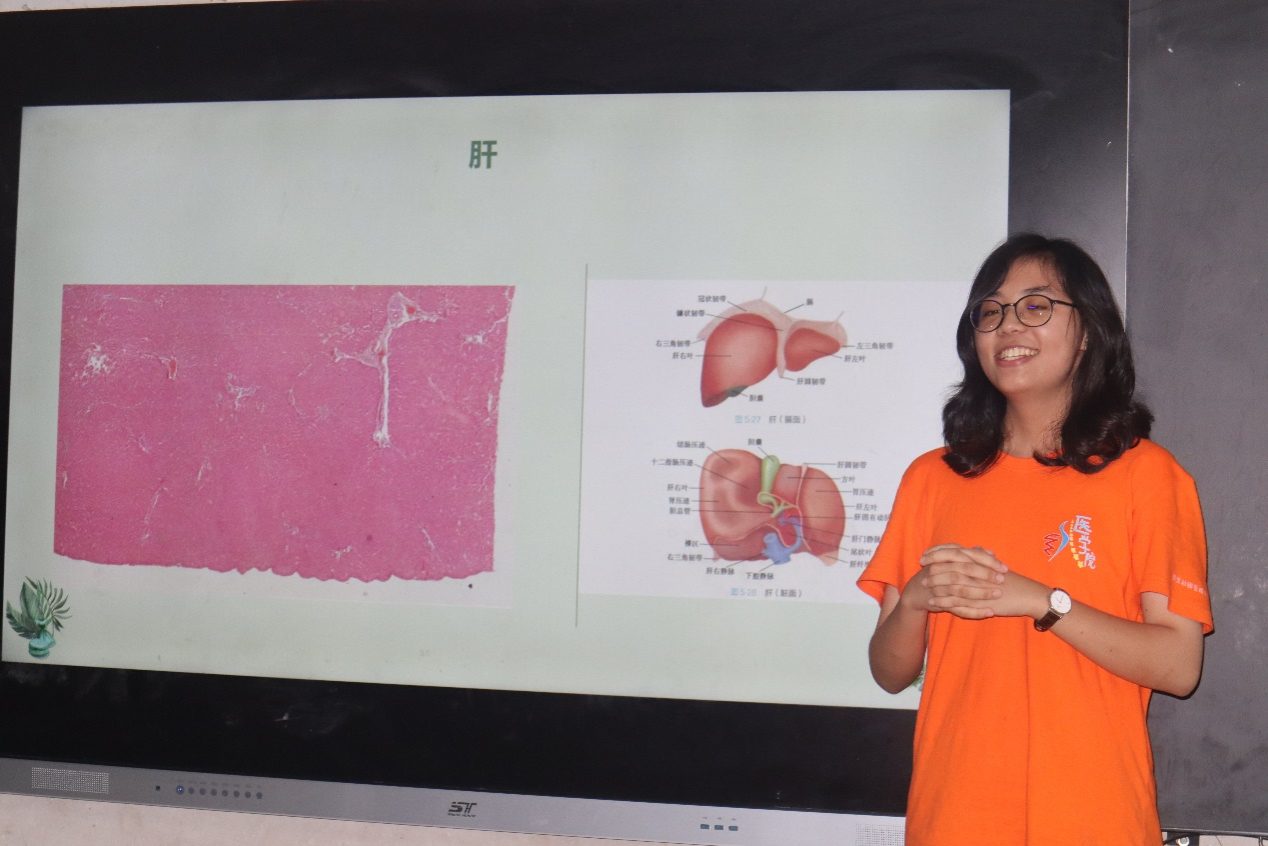 上午8点,团队成员在陈家滩九校校门口迎接学生们,并带领大家来到教室。上午8点半,课程正式开始,首先由向荣珍为学生们科普人体骨骼的相关知识,介绍了人体骨骼的组成以及预防驼背的方法,随后,蔡迪凡和孙藏月为学生们带来人体内脏和人体肌肉的基本介绍。