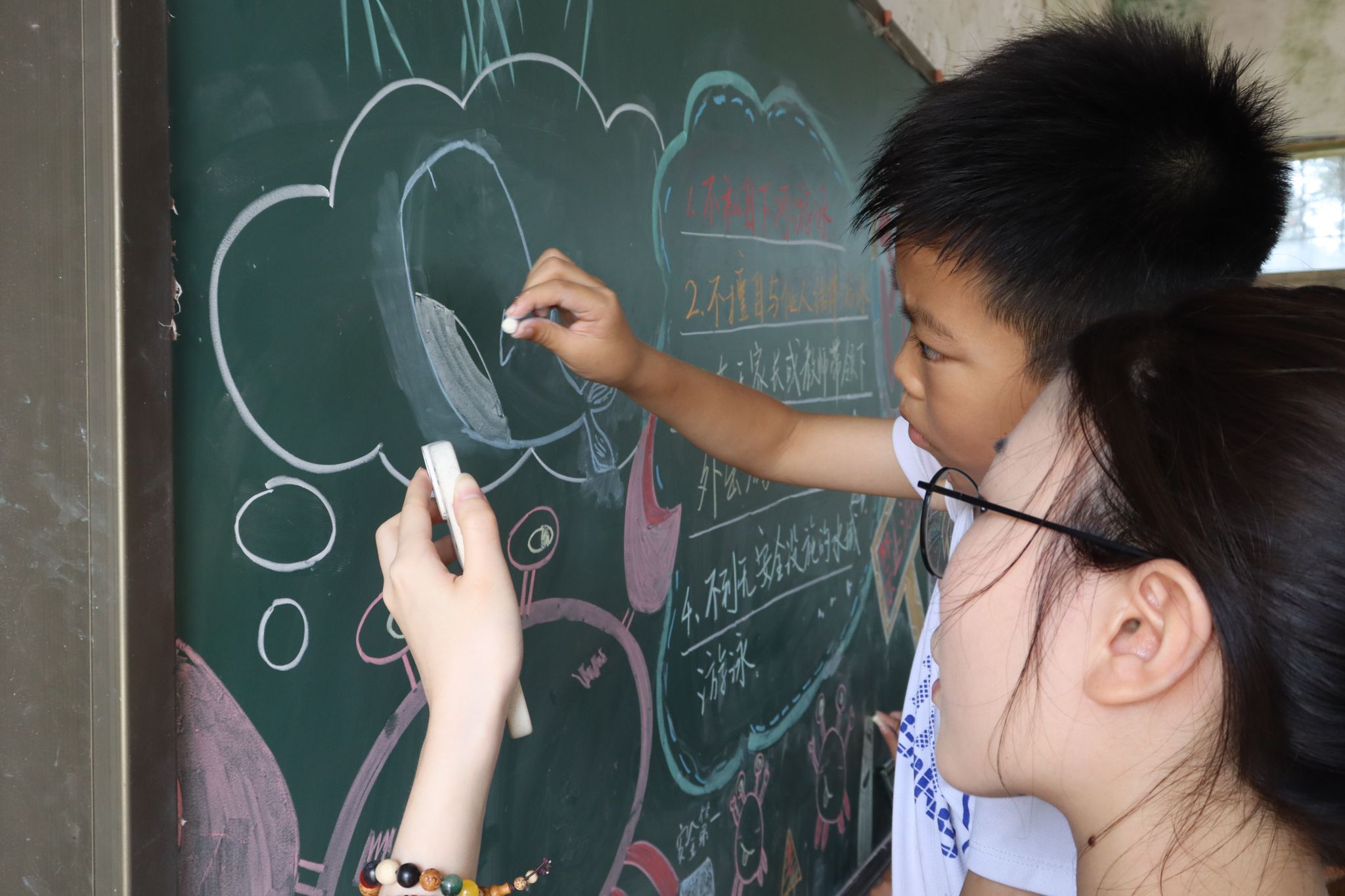 实践团成员聚焦防溺水主线知识,开展了知识讲座、绘制黑板报、学习防溺水海报、心肺复苏的讲解与演示等多种形式的防溺水安全教育,向孩子们讲解了“如何防范溺水”、“同伴溺水如何应对”、“溺水时如何自救”等相关知识。副队长朱芷墨在讲座中强调,“安全第一,珍爱生命,预防溺水,从我做起。”队长钟民涛通过张贴防溺水宣传海报,组织同学们一起学习防溺水技能,以此来呼吁大家,如遇溺水情况发生,不要贸然下水进行施救,要第一时间呼喊救援。宣传组成员陈静妍通过带领同学们绘制板报,使他们进一步熟悉了防溺水知识。