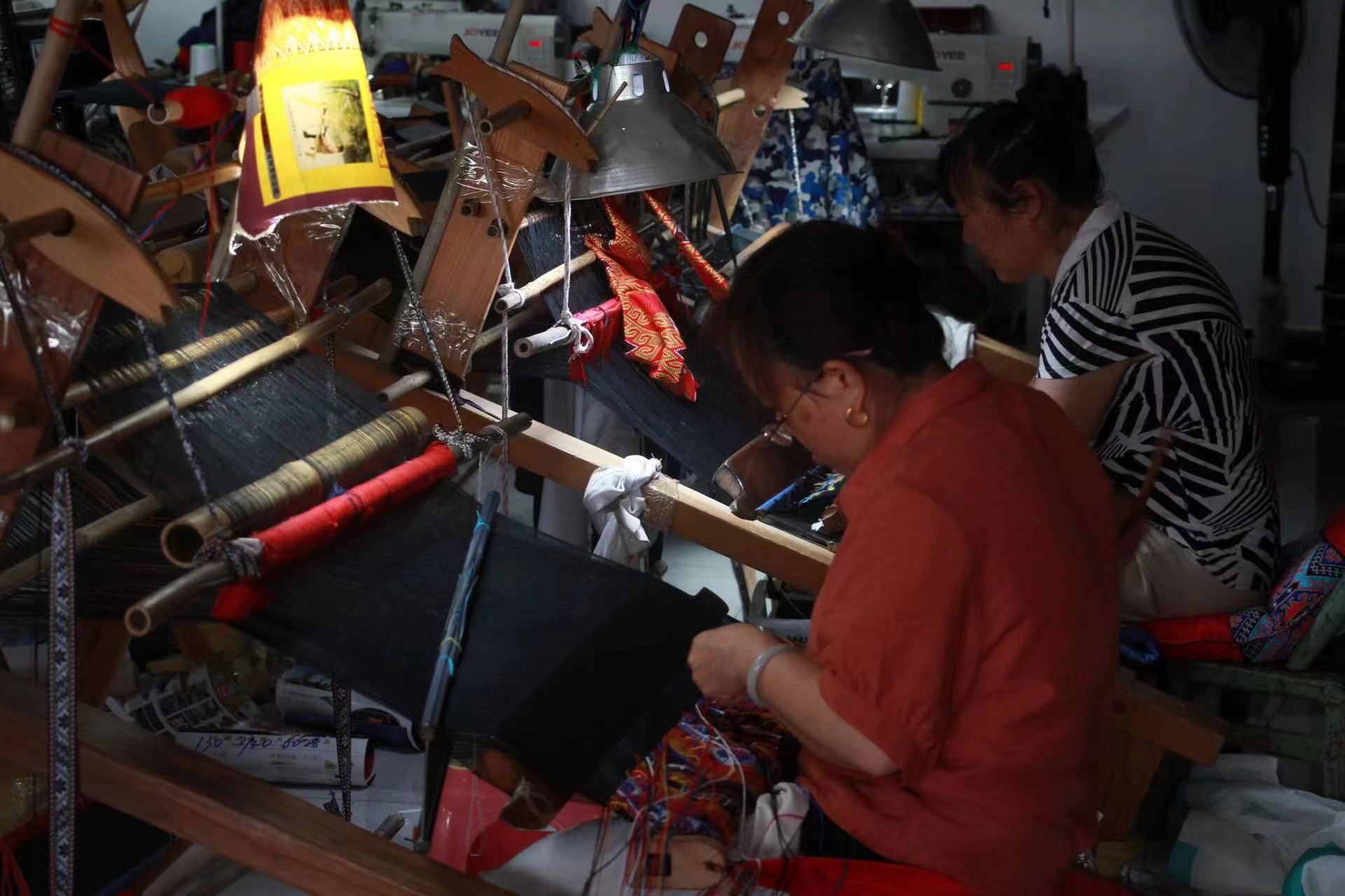初到龙山县,土家织锦州级代表性传承人叶丽萍带领团队成员参观了叶氏土家织锦传习所以及部分土家织锦作品,并演示了土家织锦的织造过程。后续为深入了解龙山县非遗文化发展现状,团队成员先后拜访了土家织锦国家级传承人刘代娥、土家织锦州级传承人黎承菊、湘西木雕州级传承人侯攀、三棒鼓州级传承人杨妙勤,并与传承人们进行了深入交流和访谈,从而了解到非遗背后蕴含的历史、文化内涵,以及其与当地社会经济发展之间的联系,此举措也为团队后续进行的品牌数字IP构建提供了新的思路。