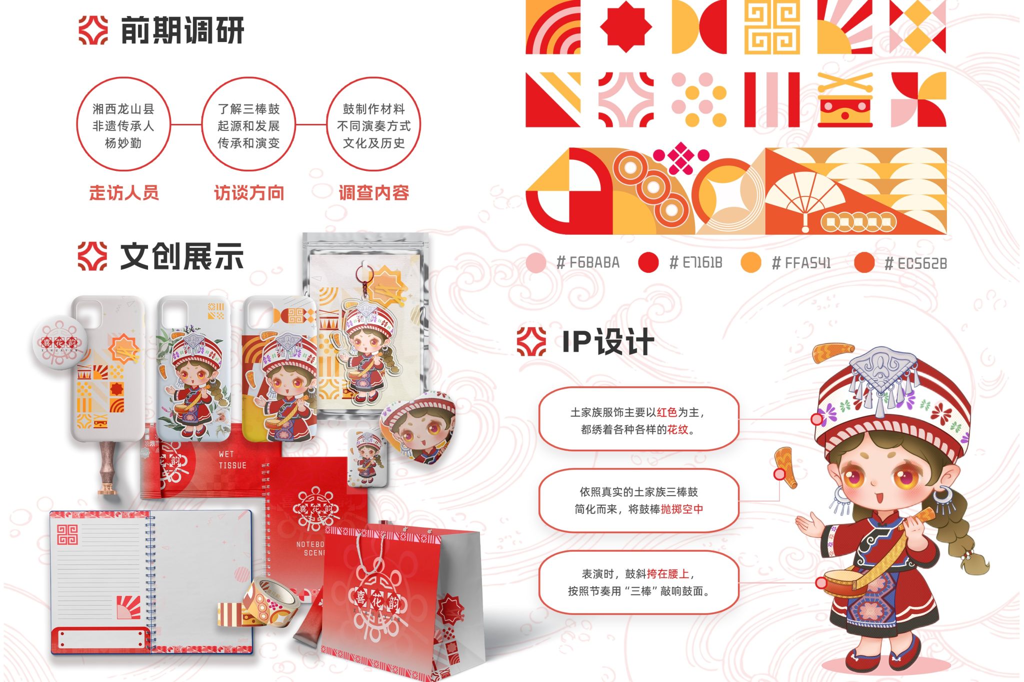 团队基于调研内容,借助图形设计软件和计算机辅助设计技术、三维建模技术等多种数字化技术,对现有的非遗产品进行了设计优化,使其更符合现代审美和市场需求,获得了当地非遗传承人的一致认可。后续,实践团进一步深入挖掘非遗品牌故事,集思广益,为土家织锦、湘西木雕、龙山大头菜、三棒鼓四项非遗项目设计了独特的品牌LOGO、IP形象以及相应的文创产品,力求设计兼具辨识度和现代审美吸引力。此举使团队构建的龙山县域非遗IP群初现雏形,团队计划未来将在此基础上逐步扩大IP群范围,使其涵盖龙山县更多的非遗品牌,并通过一系列数字化技术,如虚拟现实技术、增强现实技术、大数据技术等,进一步提升非遗传承与传播的效率和效果。