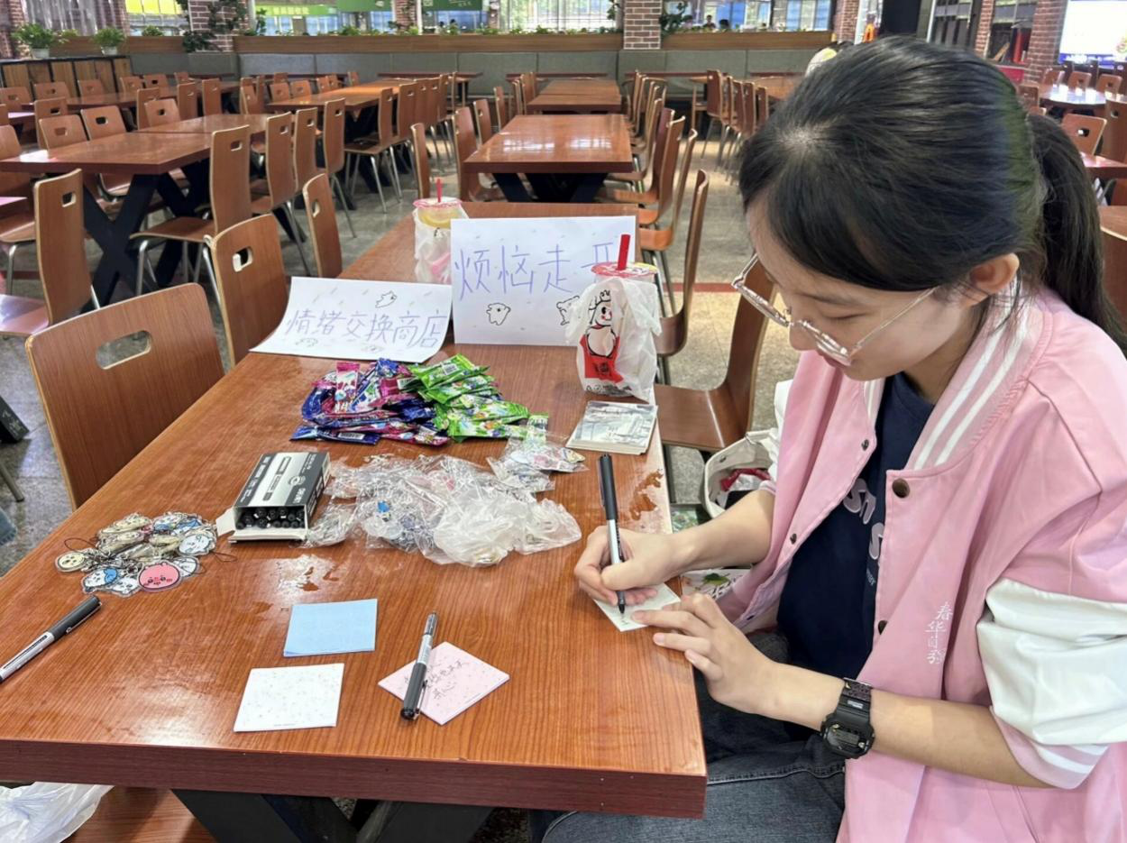 (通讯员 龚妍 苗雨悦)为帮助同学们正确释放学习与生活中的压力是、培养乐观积极的心态,4月21日下午,地理科学学院(以下简称“地科院”)春华自强社联合生命与科学学院(以下简称“生科院”)达人学社、医学院心理健康协会等社团举办“情绪交换商店”活动。此次活动于咸嘉湖校区、二里半校区、天马校区、南院校区等地同时开展,由我校学生参与。