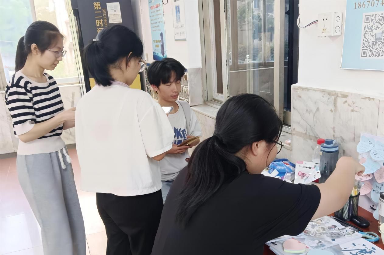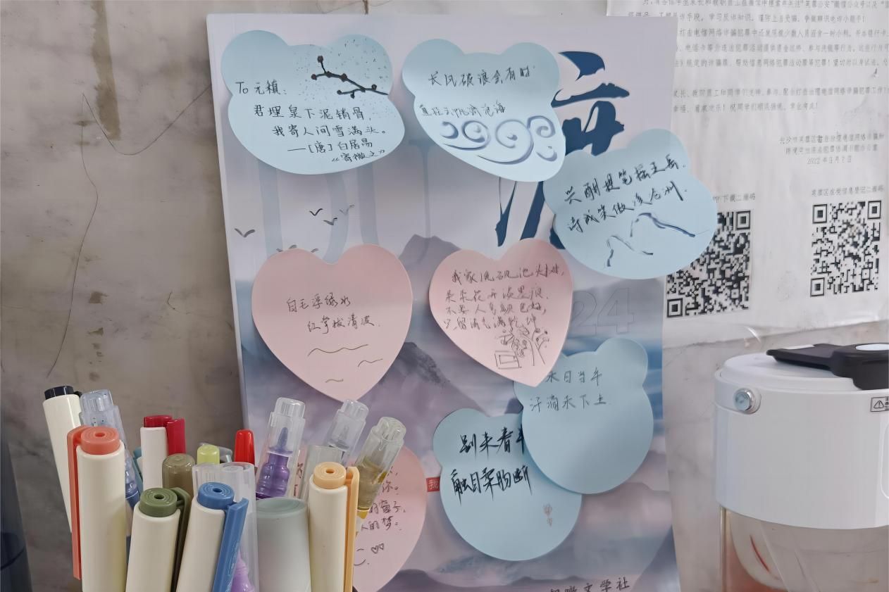 在活动现场中,同学们领取便签和画笔,发挥创意,在便签上绘制与诗词意境相契合的小物绘画和涂鸦。有的同学选择了唐诗的豪放,有的同学则偏爱宋词的婉约,每一张便签都承载着深厚的文化底蕴和个人的情感寄托。这些作品或简约或繁复,充满了同学们的个性与想象力,为诗词增添了艺术气息。完成创作后,同学们带着自己的作品来到兑换区,用诗词作品换取了朝暾文学社精心准备的诗人胸针。