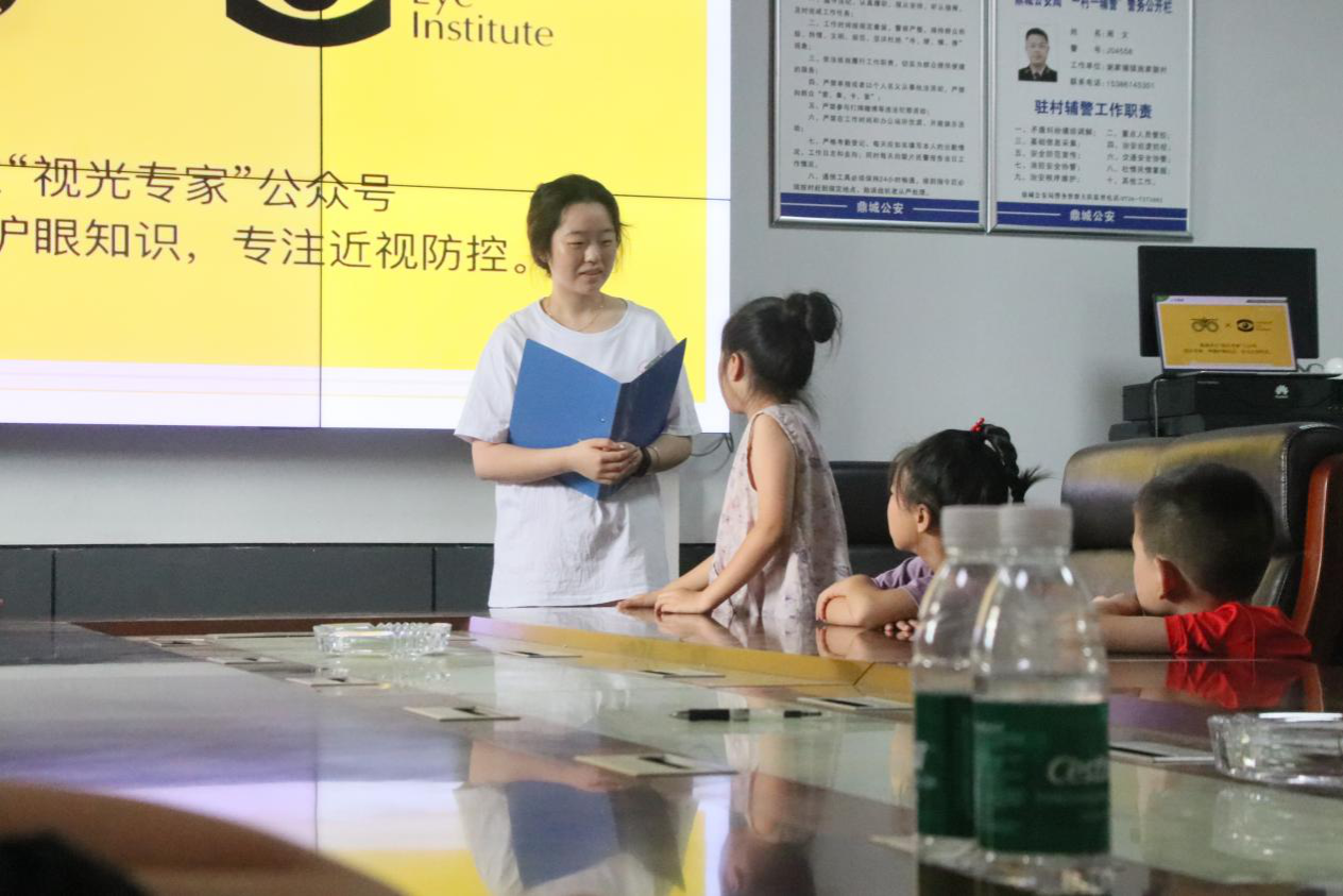 杨岱霏为孩子们介绍了眼睛的基本构成及其工作原理,让孩子们从根本上认识到了近视的形成原因。她带领孩子们朗读保护视力口诀、做眼保健操,向孩子们传授了预防近视和保护视力的方法。