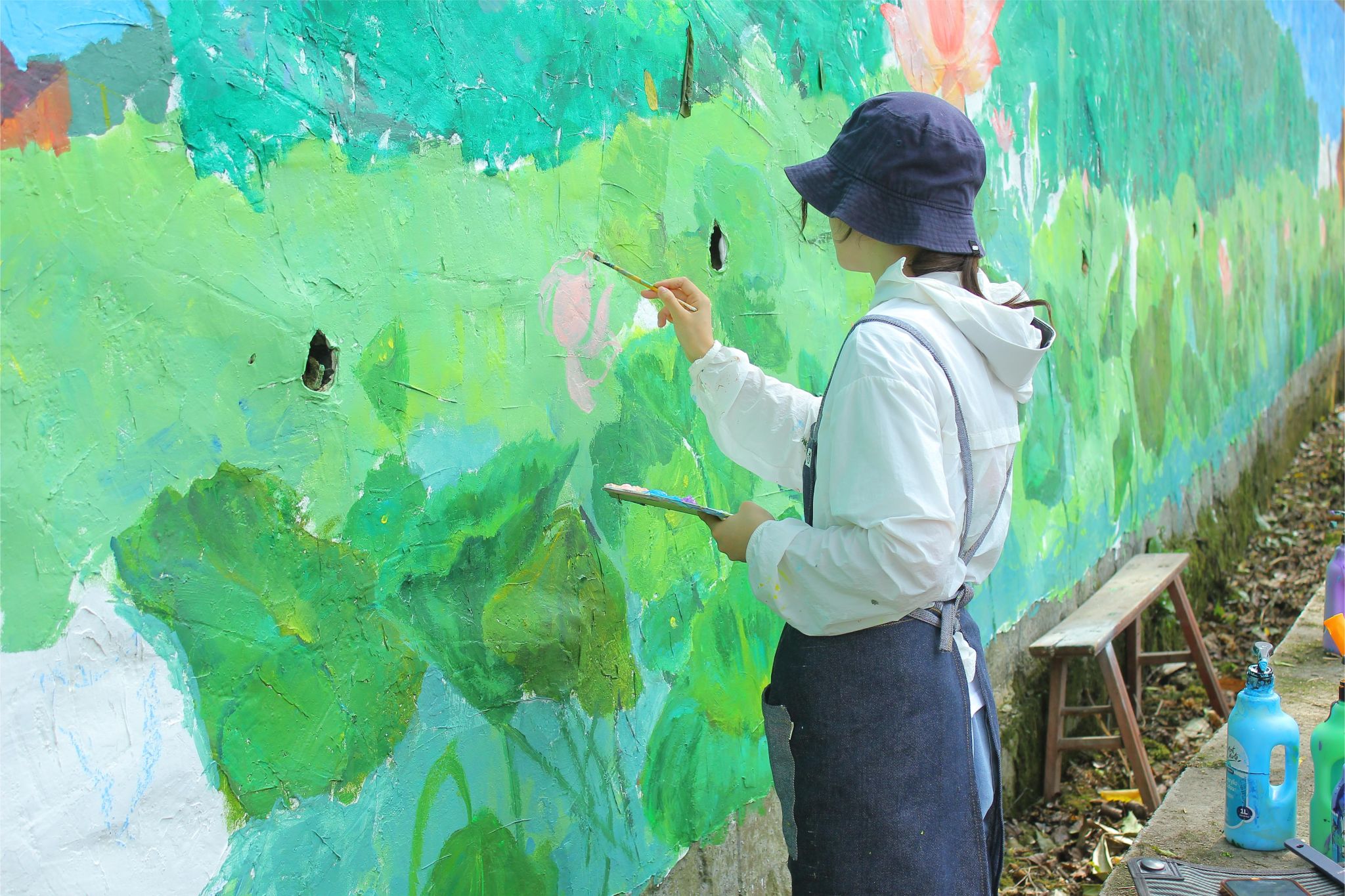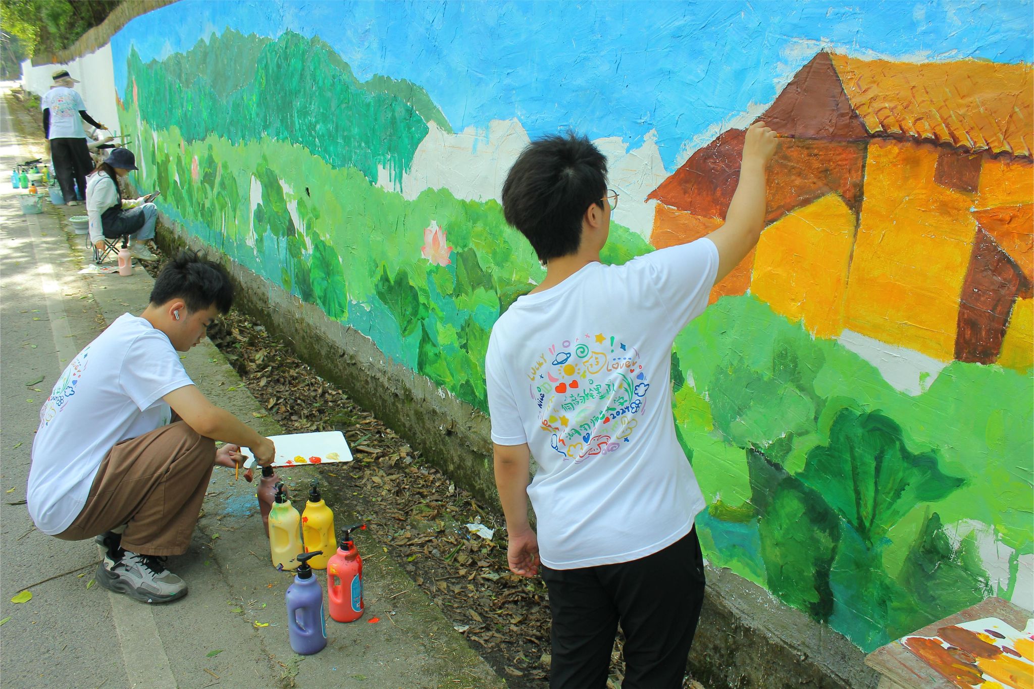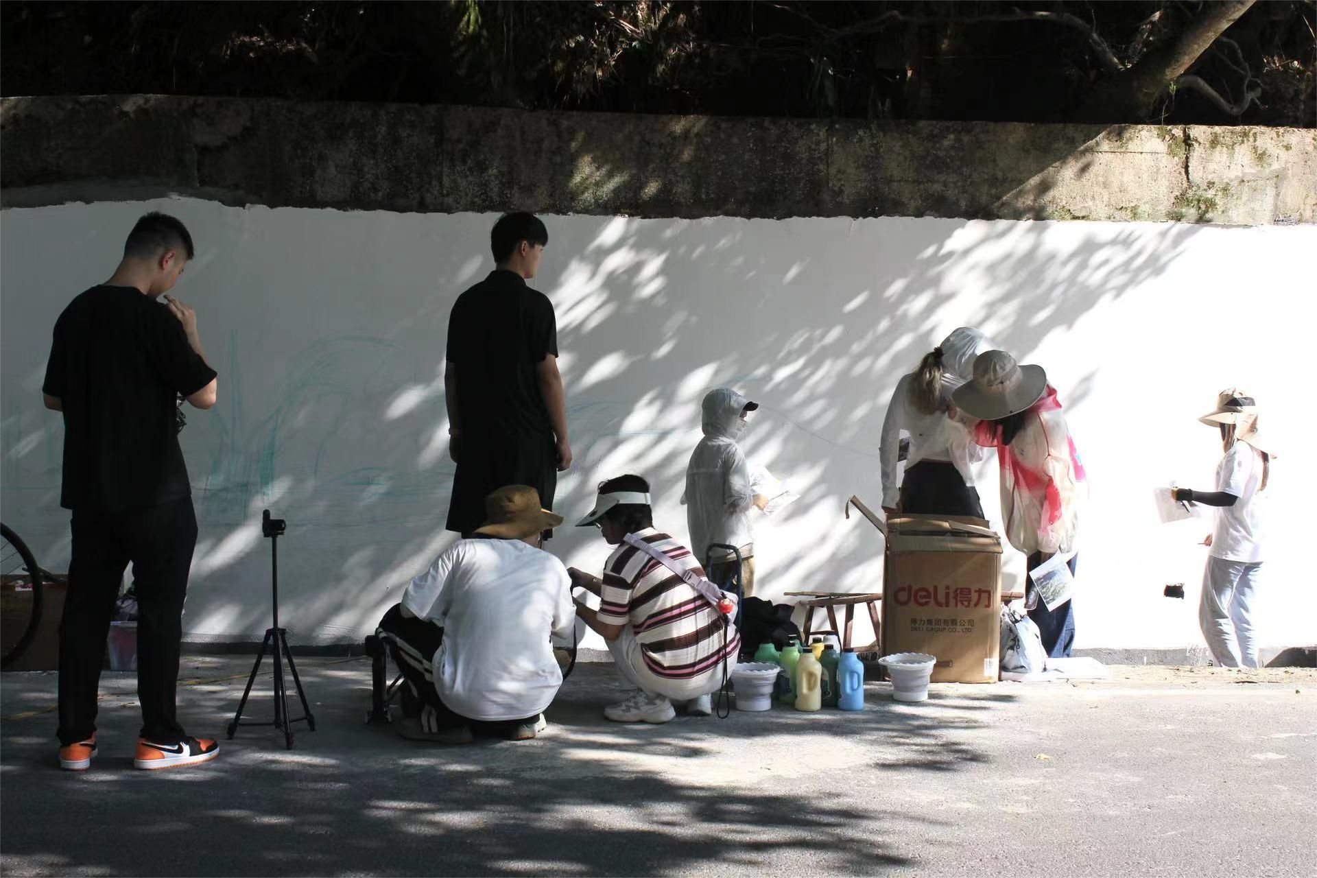 在现场,队员们头顶骄阳,心怀希望,以木脚村的自然风光、人文历史为原型,在墙上仔细地描边勾勒、涂彩上色,一笔一画尽显用心与专业。一幅“新时代木脚画卷”会成为文旅宣传的新窗口。