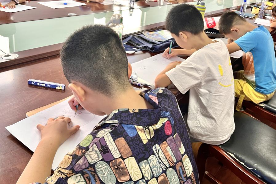 杨科介绍了实践团成员的基本情况和假期公益讲习班的课程安排,介绍了课堂“成就之星”的计分规则。实践团成员依次上台进行自我介绍,对同学们的到来表示热烈欢迎并进行了第一次授课,一起指导同学们用画笔描绘家乡、梦想或卡通形象,展示其丰富多彩的内心世界。