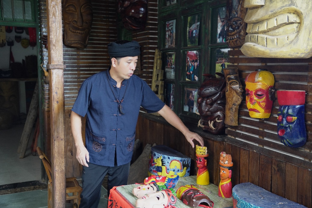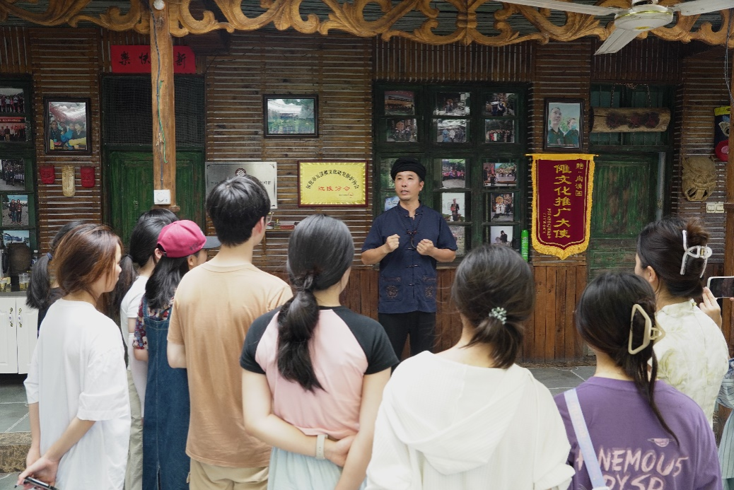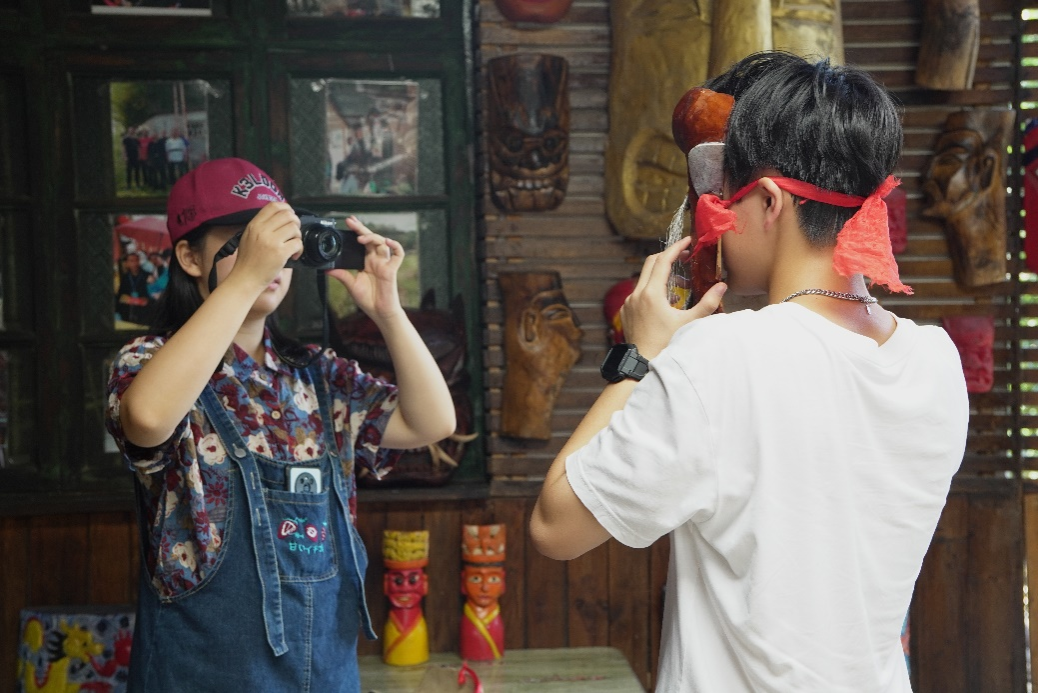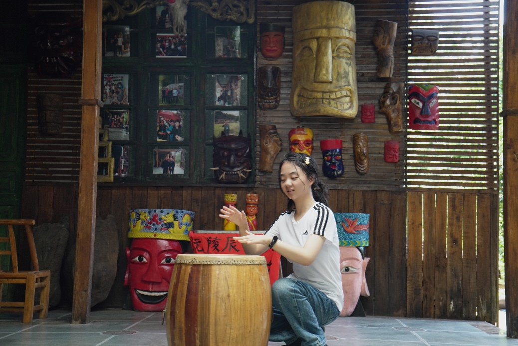 在参观过程中,傩文化推广大使向国清围绕“辰州傩戏中傩面具的传统制作技艺”给队员们展开介绍。他说到,傩戏作为一种色彩鲜明的歌舞戏曲,傩面具是其中最重要、最典型的组成部分,是民间艺术的瑰宝。听着向国清的解说,队员们还了解到傩堂正戏、小戏、大本戏三种不同内容形式,和绝技表演傩技如上刀梯、过火槽、踩犁头等。随后,向国清让队员们体验傩戏用具、感受傩面具制作的漆画工艺。活动结束后,实践团调研组成员在辰州傩戏非物质文化遗产基地前合影。