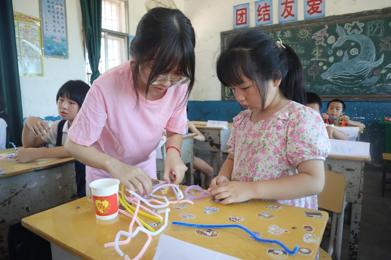在手工课上,实践团成员准备了扭扭棒和漆扇等手工材料,引导孩子们制作出一个个精美的手工艺品。这些活动不仅锻炼了孩子们的动手能力,更激发了他们的艺术审美能力。孩子们在老师的鼓励下,大胆尝试,勇于创新,每一件作品都承载着他们对美好生活的向往和对艺术的热爱。