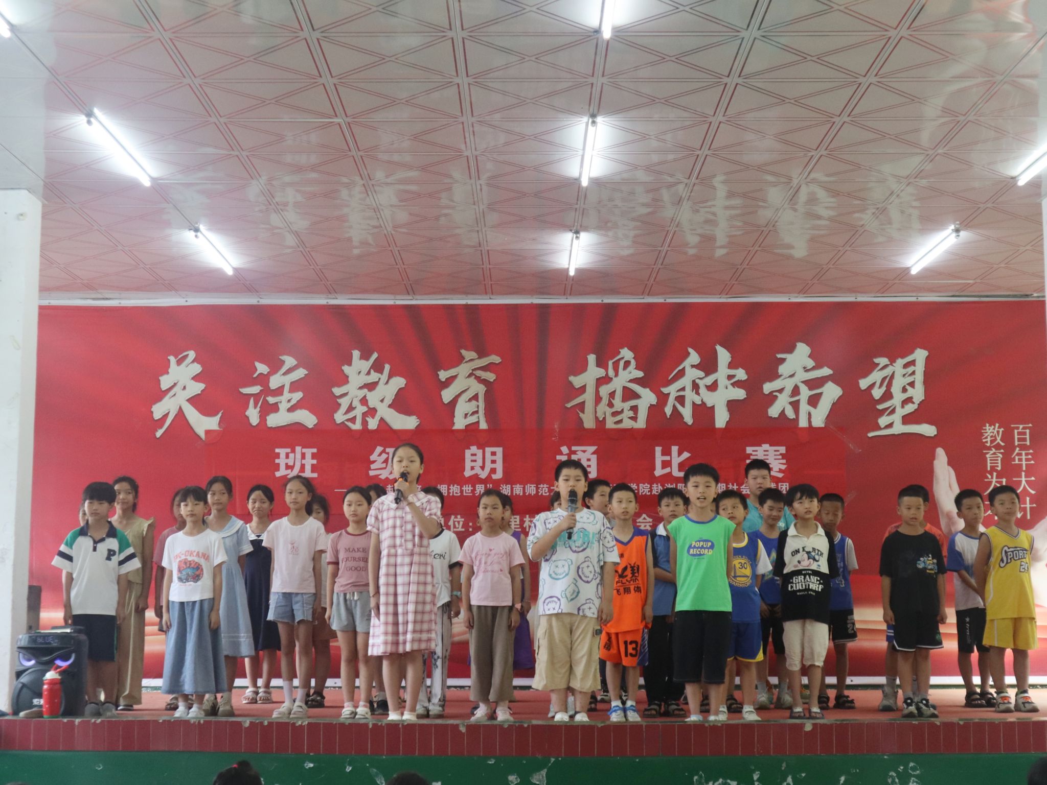 (通讯员 柴玥琪 黄可佳 刘剑)7月20日上午,公共管理学院“抬起头来,拥抱世界”赴浏阳市暑期社会实践团(以下简称“实践团”)在端里完全小学礼堂举办班级朗诵比赛。此次比赛以班级为单位,由实践团成员担任主持人及评委。