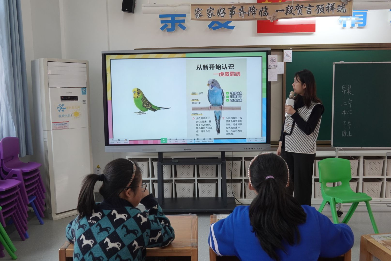 此次活动分为介绍动物伙伴、讲解喂养注意事项、友好互动三个环节。活动伊始,实习生与各班班主任带领学生将动物伙伴引入教室,并向学生详细介绍动物伙伴的品种特征和生活习性。随后,学生从饲养环境、日常饮食、卫生清洁等方面了解喂养时的注意事项。最后的友好互动环节中,实习生协助班主任组织学生分组轮流接触小动物,并对抚摸姿势、互动距离等安全问题进行强调。实习队员全程维护现场秩序,确保互动安全。