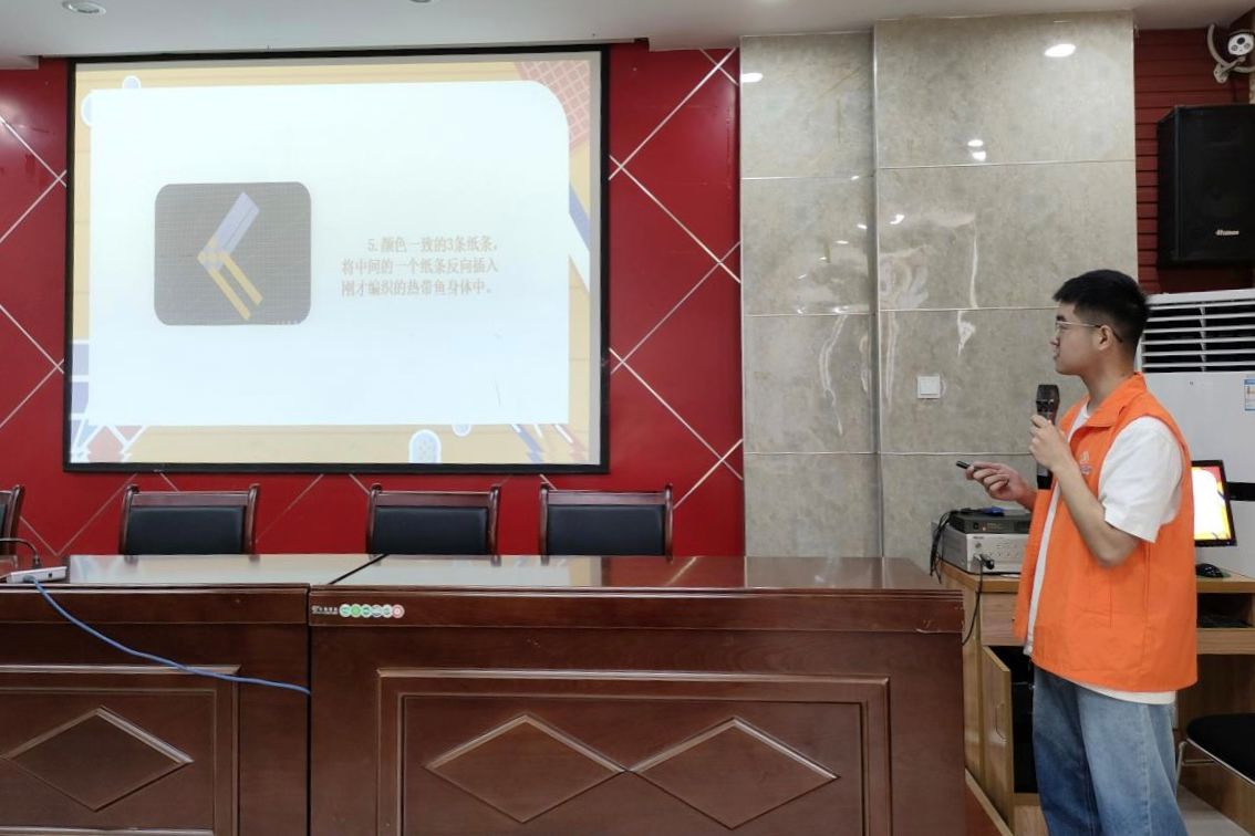 活动伊始,主讲人从纸编的起源出发,详细介绍了纸编的发展历程、技法特点以及艺术示例。通过主讲人的讲解,参与者了解到纸编技艺从古代到现代的演变过程,以及它在中国传统文化中的独特地位。主讲人还示范了裁剪、折叠、编织等基本技巧,展示了如何将简单的纸条编织成精美的工艺品。参与者认真听讲,观察操作步骤。在志愿者的帮助下,参与者动手制作纸编作品,从简单的纸条编织到稍复杂的图案设计,逐步掌握技巧,制作出纸编手环、纸编小船等作品。