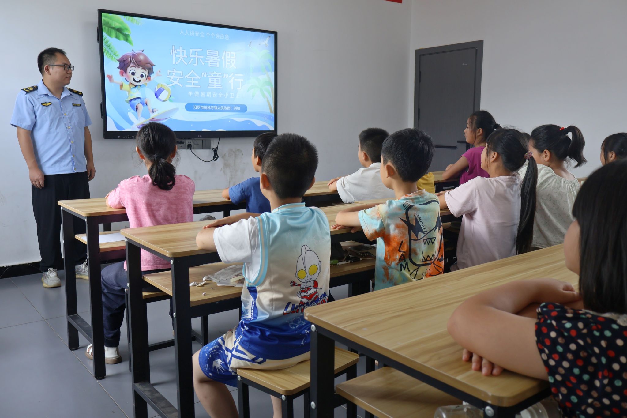 活动开场,汨罗市管理局刘站长分别从“交通安全”“防溺水”“用火安全”“用电安全”“燃气安全”开展暑期安全教育。他先以真实交通事故案例切入,提醒孩子们遵守交通规则,骑车戴头盔等,又在“防溺水”课堂提醒小孩子切勿单独下水、发现同伴遇险要及时呼救,并以家庭插座过载和电线老化为例,教孩子们识别线路故障、断电急救。整个宣讲图文并茂、案例鲜活,孩子们认真观看、踊跃互动,将安全知识深深刻进心里。