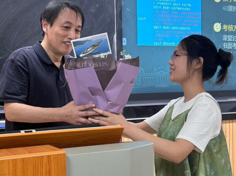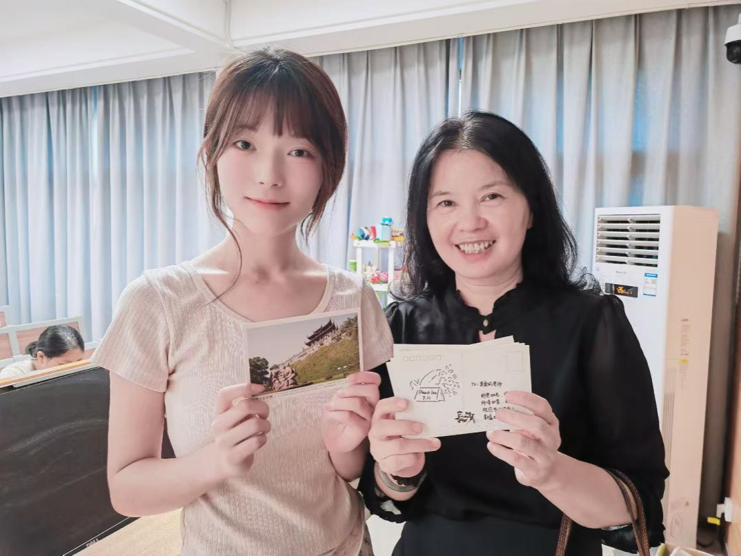 “纸短情长·花香寄情”活动以班级为单位开展,同学们在明信片上写下对老师的祝福并制作扭扭棒花束,由班长统一赠与教师节当天的授课老师,收到礼物的老师们脸上有笑容展现。