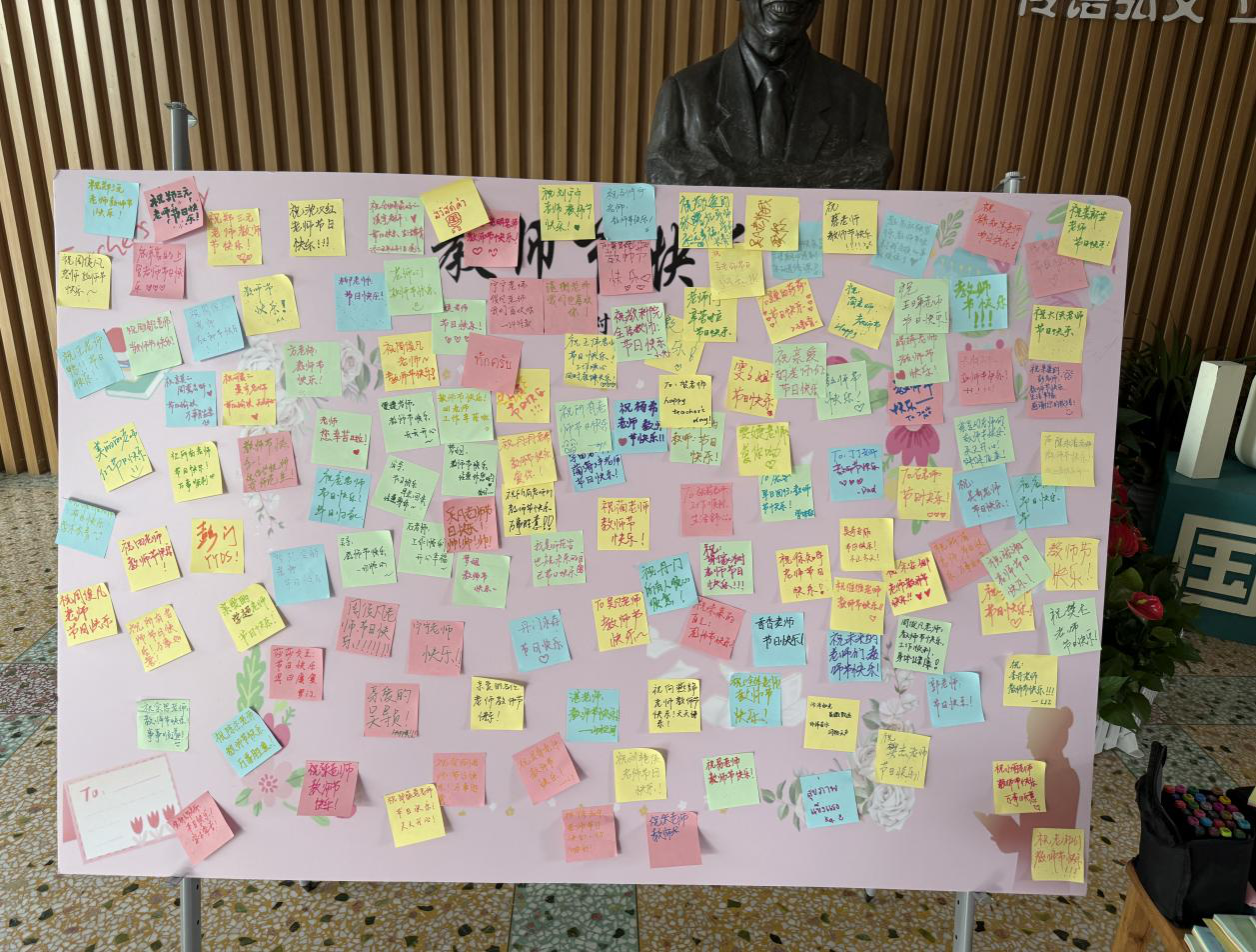 “心语传情·爱满教科”活动是在教科院一楼大厅设置暖心的祝福展板,全院师生随机在便利贴上写下节日的祝福,最终汇成爱心留言墙。