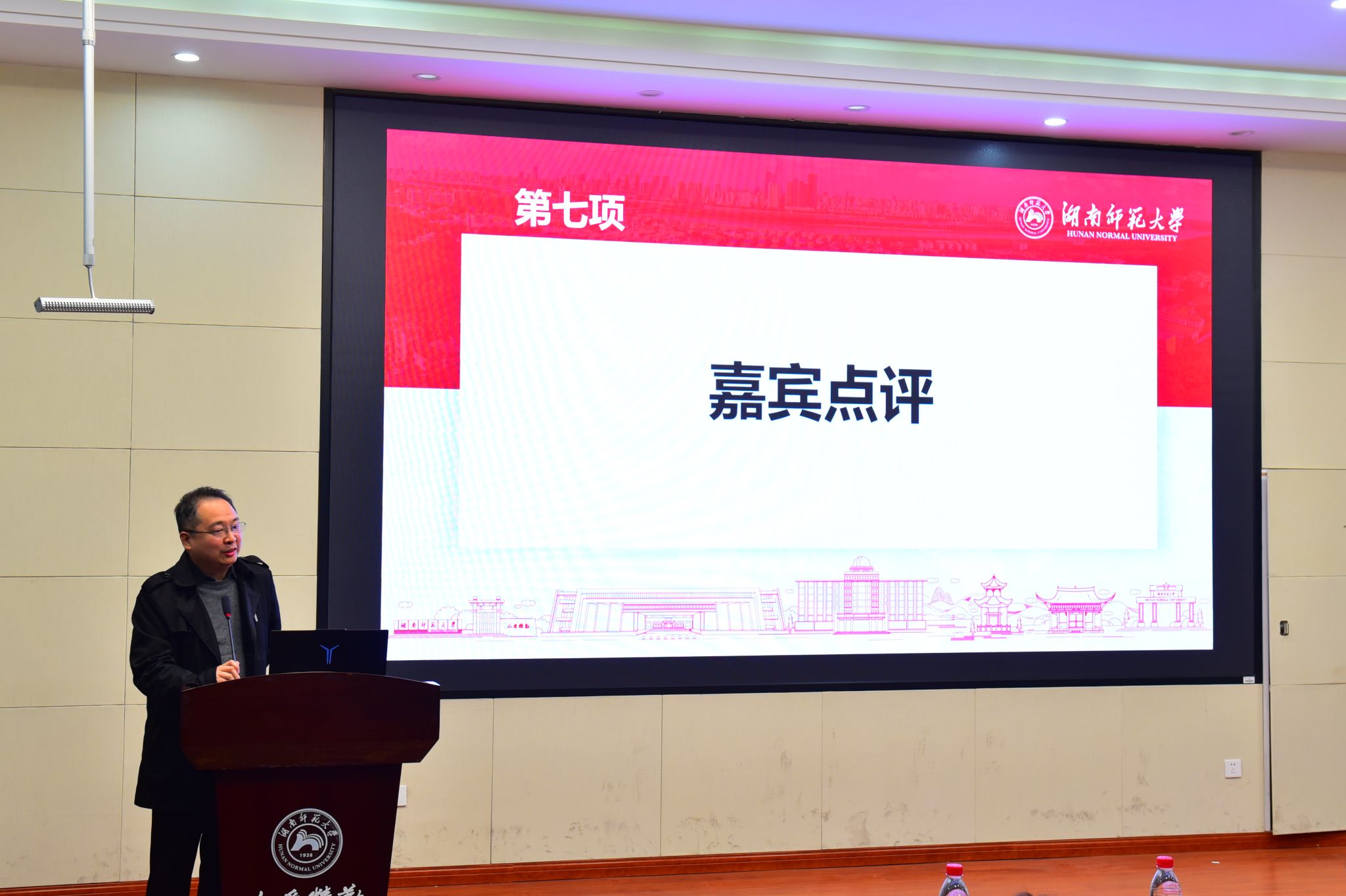 沈竹对此次红色论坛进行点评总结。他先对同学们报以真诚的感谢和热烈的祝贺,并对五位主讲人的精彩表现给予高度肯定,特别提到许多同学佩戴党徽,结合亲身经历讲述专业与初心使命的融合。同时,他提出“红色基因”的思考问题,带领同学们解读“四中精神”核心,呼吁同学们发挥多学科融合优势,以红色基因引领未来发展。点评结束,各位嘉宾、五位主讲人与在场工作人员共同合影。