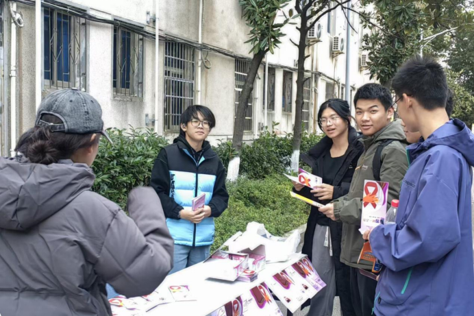 活动于每日午餐时段在食堂前坪设置固定宣传点,文学院学生志愿者按时集结,有序开展服务。现场通过主动发放与自助领取相结合的方式,向师生提供防艾宣传手册、防护用品及主题宣传挂件。志愿者们还就艾滋病传播途径、预防措施和常见认知误区等内容进行同步讲解。李咏雪现场接受咨询,针对防护细节及相关知识进行专业解答,传递“科学防艾、平等关爱”的健康理念。