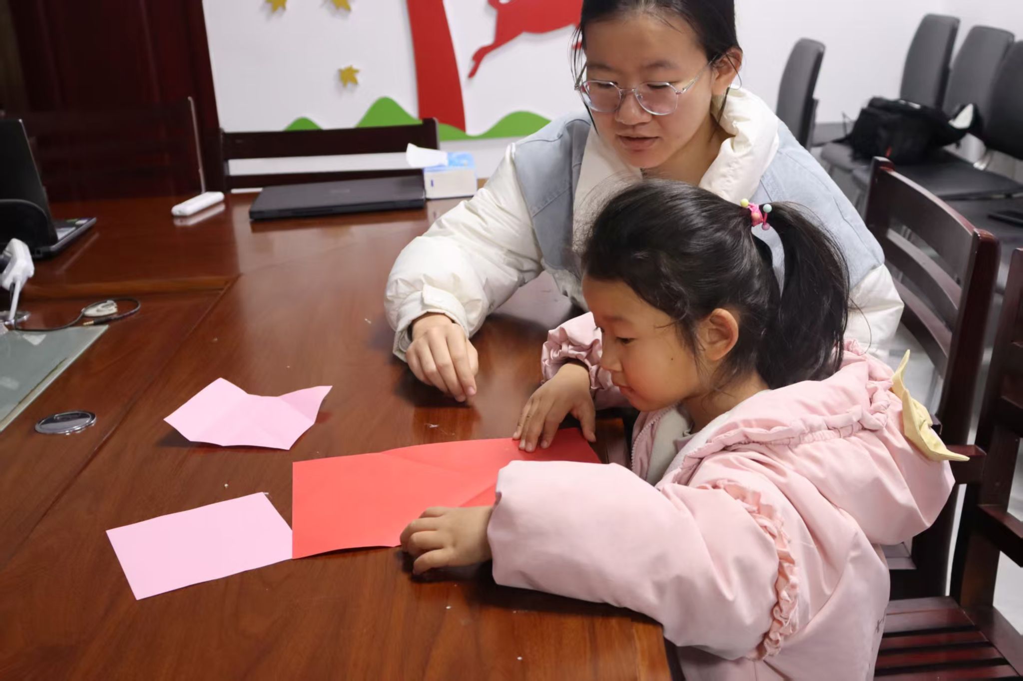 活动伊始,主讲人将折纸与中华传统文化相结合,向小朋友们介绍了折纸艺术的历史渊源与文化内涵,激发孩子们对折纸艺术的兴趣。为增强互动性,主讲人设置问答环节,围绕折纸基本知识进行提问,志愿者引导小朋友们举手回答,加强对折纸的了解。在手工制作环节,志愿者与小朋友进行一对一合作,共同完成纸飞机、千纸鹤等手工折纸作品,锻炼动手能力的同时深化对折纸艺术的理解。