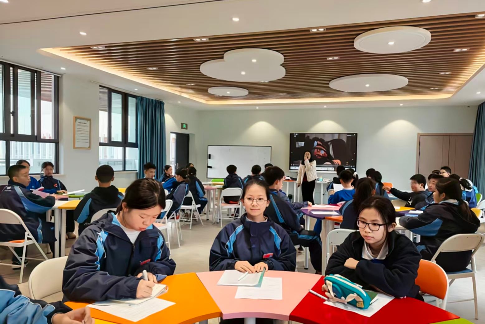 课程伊始,郑湘陵围绕“我是谁”心理主题展开教学,通过教学视频引出哲学思考——“我是谁?”,并以小组为单位分发导学案。其中将“我的九宫格”中与自我相关的问题,作为整节课堂贯穿始终的线索,包含“物质的我”、“社会的我”、“精神的我”三个层次,郑湘陵逐层分析,询问学生对于这三层“我”的认识,结合问题帮助学生建立对自我的真实认知。