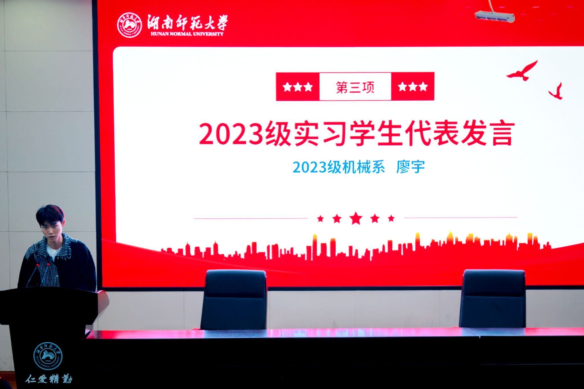 实习生代表廖宇、指导教师代表李逸飞先后作表态发言,承诺将以严谨务实的态度完成实习任务,严守纪律、履职尽责。林海军致辞,他提出了三点要求:一是认真准备,明确目标;二是虚心学习,认真教学;三是遵守纪律,共同进步。梁勇作总结讲话,他要求全体师生珍惜实践机遇,夯实教学本领,严守意识形态红线与安全底线,以过硬素养展现师大学子风貌。