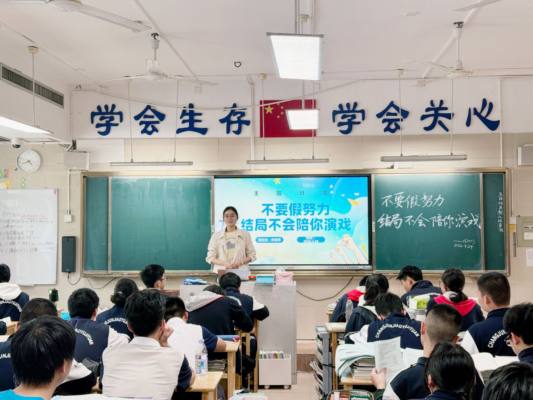 此次班会围绕班级建设与学风引导两大主题有序展开。实习队员何灵倩与宋红霞根据班级实际情况设计班会内容,分别以“破冰聚力,同心同行”“不要假努力,结局不陪你演戏”为主题,通过趣味互动游戏、案例分析、经验分享、小组讨论等形式,引导学生增强集体归属感、提升团队协作意识,同时帮助学生认清“假努力”现象、树立科学学习观念、养成良好学习习惯。班会环节紧凑、互动充分、氛围热烈,展现了实习队员的教学设计能力与课堂组织水平。