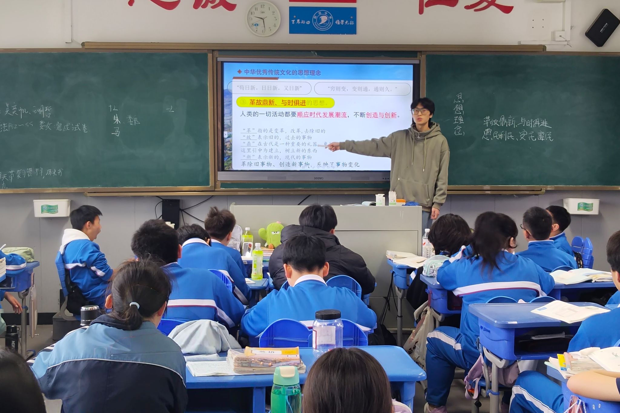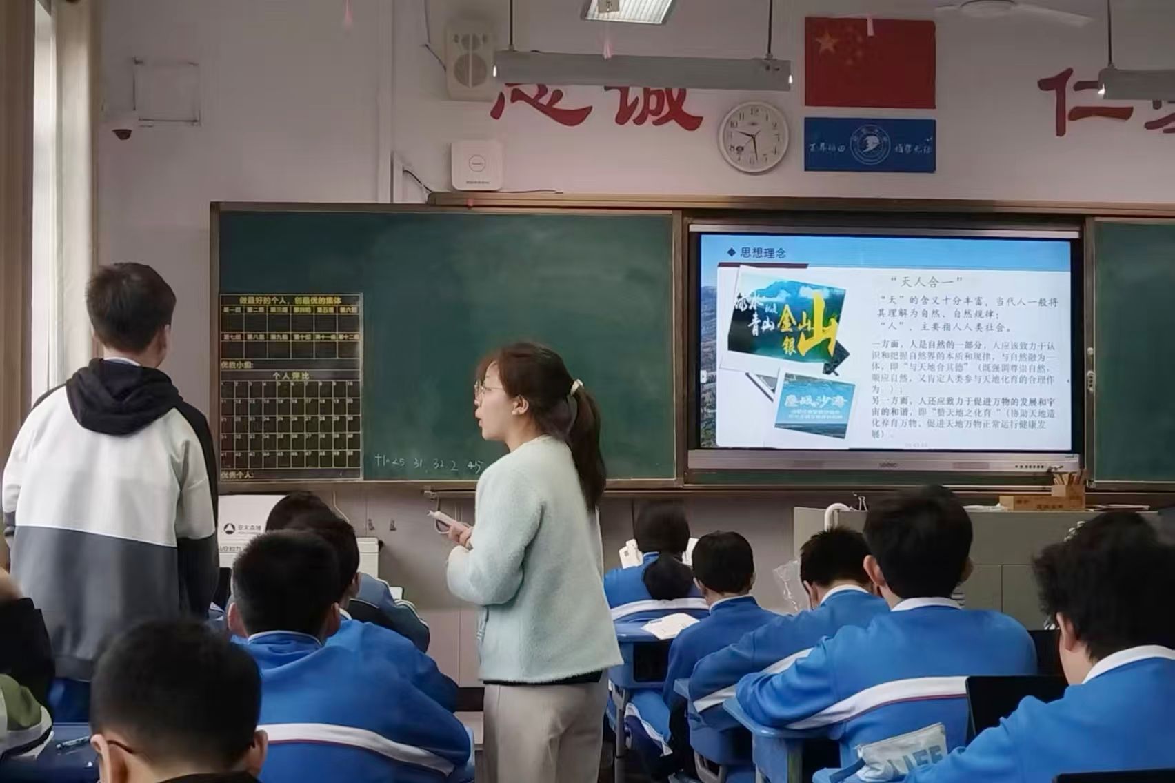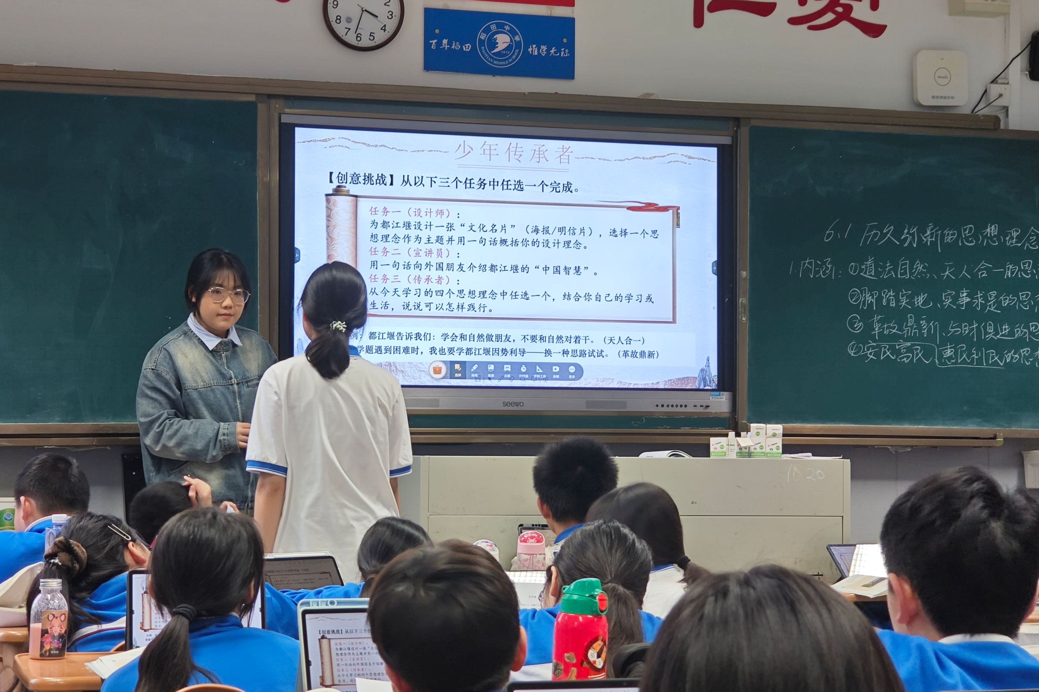 在马院老师伍屏芝的指导下,三位授课队员结合课标考点及学生学情,围绕本单元“传承中华优秀传统文化”的教学核心,以“都江堰”这一历史悠久、设计精妙的水利工程为切入点创设教学情境,开展课堂教学。备课过程中,三位队员聚焦教学重难点,坚持合作探究、集思广益,使教学情境、教学活动与教学内容有机契合。在授课环节,三位队员各有侧重。佘冠伶注重议题式教学的引导作用,坚持问题导向;曾彦文以节气、美食导入新课,着力激发学生兴趣;文诗颖则借助贴近生活的视频,以趣味化、生活化的方式激活学生思维。